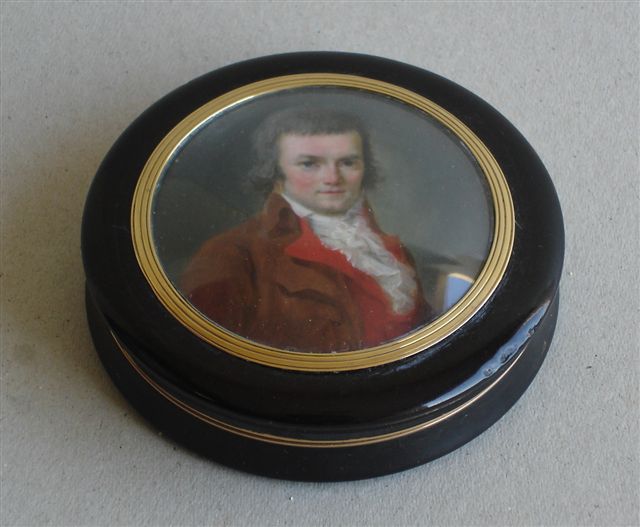 BOÎTE ronde en écaille foncée, l'intérieur cerclé d'or. Couvercle orné d'une miniature sur ivoire attribuée à François FERRIÈRE, représentant un homme à la lavallière en buste de trois-quart. Poinçon au coq, Paris, 3ème titre. Maître-orfèvre illisible.