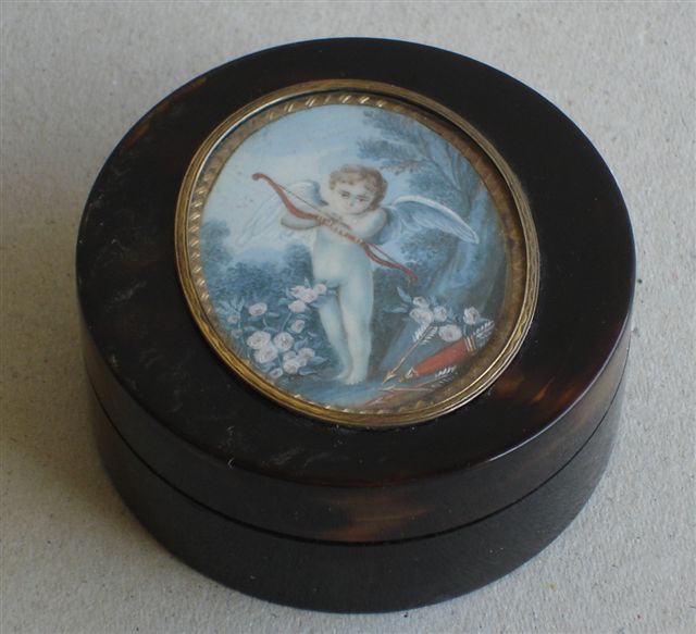 BOÎTE en écaille foncée ornée sur le couvercle d'une miniature ovale sur ivoire cerclée de cuivre doré , représentant Cupidon armant son arc. Début XIXème siècle. Paris.