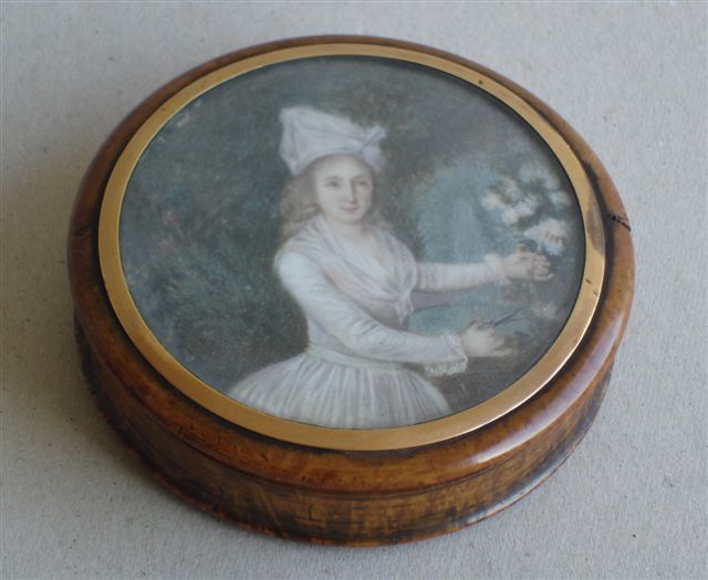 BOÎTE en loupe d'amboine doublée d'écaille sertie d'une large miniature bordée d'un filet d'or, portrait de jeune femme coupant des fleurs avec une paire de ciseaux.