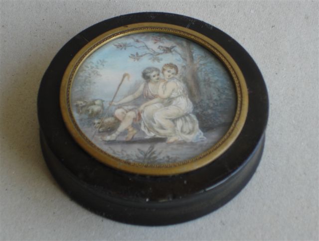 BOÎTE en bois noir à bords concaves et intérieur en écaille, entourage en bronze ciselé. Elle est sertie d'une miniature sur ivoire, scène des bergers d'Arcadie sur fond de paysage. Fin du XIXème siècle. Haut. 1,8 cm, Diam, 8,3 cm.