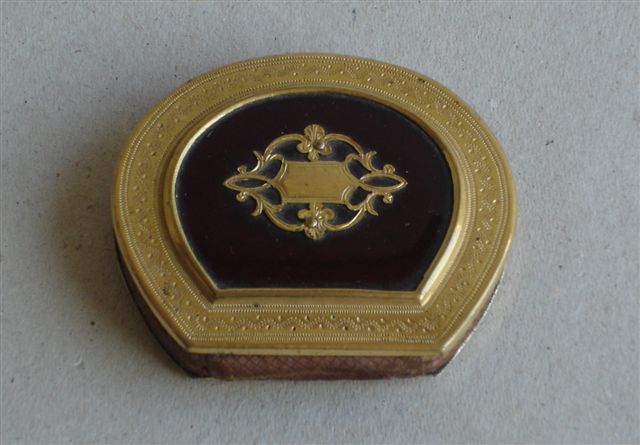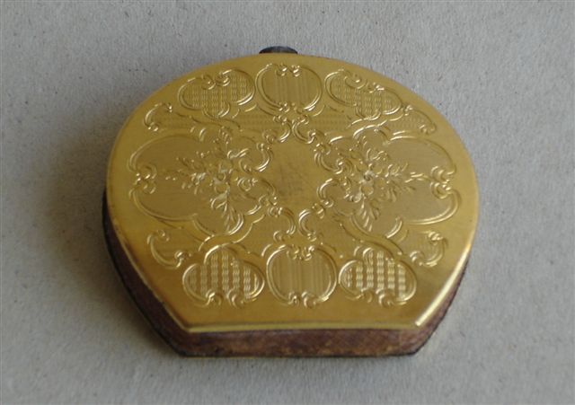 PORTE-LOUIS miniature ovoïde en or-métal doré (?), à fond rouge mordoré. Il est orné en son centre d'une étiquette bordée de feuillages et bordé de vagues ponctuées. L'autre face est décorée de cartouches gravés de motifs fleuris, vaguelettes et de guillochages.