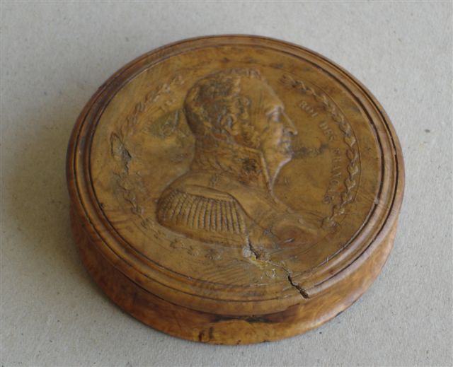 BOÎTE en loupe d'amboine doublée d'écaille rouge ornée sur le couvercle du profil sculpté de "Louis-Philippe Ier, roi des Français" décor guilloché sur l'autre face.