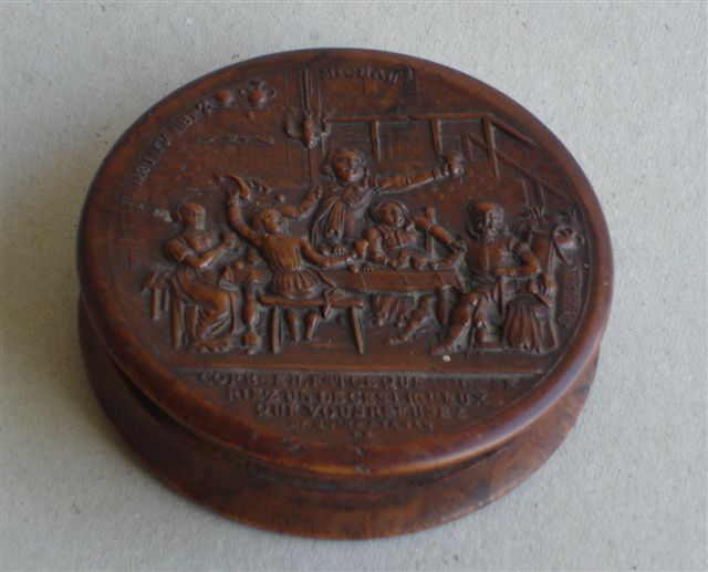 BOÎTE en loupe d'amboine doublée d'écaille, le couvercle sculpté d'une scène de taverne "Henri IV chez Michau, Corbleu est-ce que vous seriez un de ces ligueux que vous refusez de boire à sa santé", sur l'autre face, décor gravé de points et cerclage de piastres.