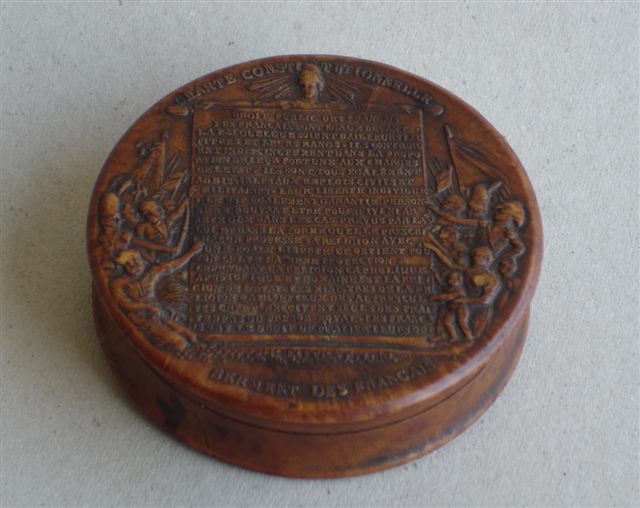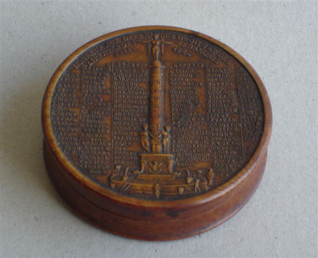 BOÎTE en loupe d'amboine doublée d'écaille, ornée sur le couvercle de la "Charte Constitutionnelle, Serment des Français". Elle est sculptée, sur l'autre face de la colonne du Chatelet, "Honneur aux Défenseurs des Droits et des Libertés des Français, année 1820" ainsi que la liste alphabétique des députés. Vraissemblablement en commémoration de la loi sur la liberté de la presse.