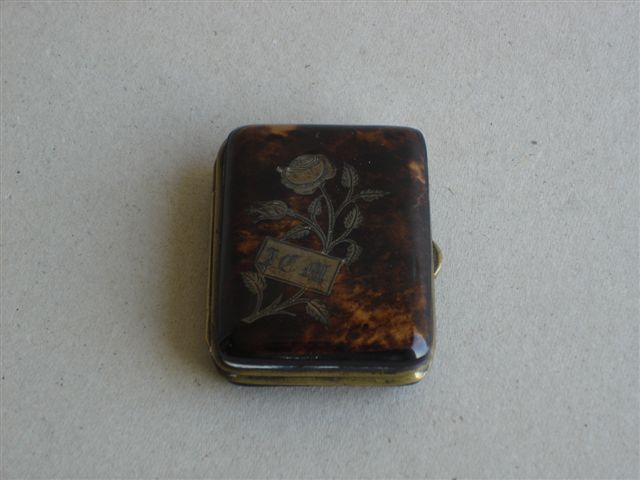 PORTE-LOUIS rectangulaire miniature en imitation écaille ornée sur une face d'une rose en métal gravé, dans ses feuilles, le monogramme "JCM". Fin XIXème