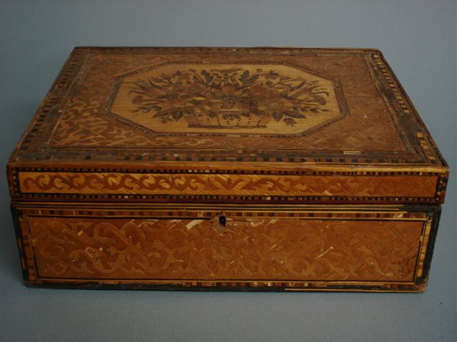 COFFRET à ouvrages en marqueterie de paille à décor de rinceaux et chevrons dans des encadrements à damier. Couvercle marqueté d'une riche corbeille de fleurs dans une réserve à pans. L'intérieur découvre un étage supérieur mobile à six cases fermées de vantaux marquetés double face de paille teintée: trophée d'instruments de musique et carquois de flèches, retenus par des noeuds de ruban. Etage inférieur masqué par un fond articulé marqueté sur les deux faces de rinceaux à décor d'un paysage à la cathédrale et d'oiseaux sur une fontaine dans des réserves à pans. Miroir à l'intérieur du couvercle.