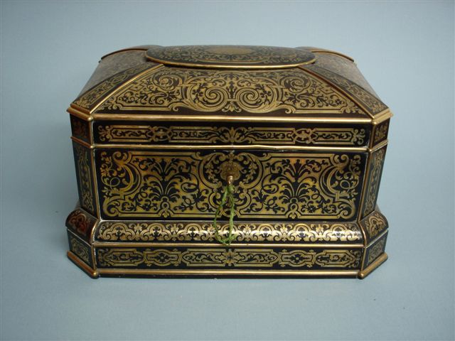 COFFRET rectangulaire en marqueterie dite "Boulle" de laiton et bois noirci. La base en plinthe rejoint une caisse droite en quart de rond. Pans formant pilastres aux angles, prolongés et convergents sur le couvercle bombé. Un compartiment ovale est dissimulé en son centre. Tiroir secret latéral en double fond. Riche et fine marqueterie toutes faces de rinceaux, palmettes, feuilles d'acanthe gravées, adjointe de baguettes de laiton (mques aux angles). Avec sa clef. Travail de la Maison VERVELLE.