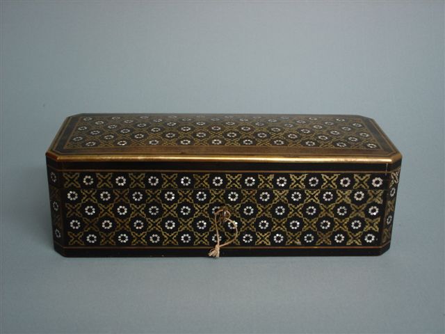 COFFRET rectangulaire à pans en bois noirci marqueté toutes faces de motifs cruciformes en laiton formant quadrillage, et de nacre en motifs circulaires. Couvercle légèrement bombé et face articulée.