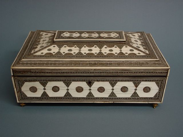 COFFRET à ouvrages à incrustations toutes faces de bois, d'os, d'ivoire et d'éléments en composition à motifs géométriques et en frises dans des encadrements. L'intérieur découvre un étage mobile à nombreuses cases fermées de couvercles incrustés. Miroir amovible à l'intérieur du couvercle. Pieds toupie en bronze doré.