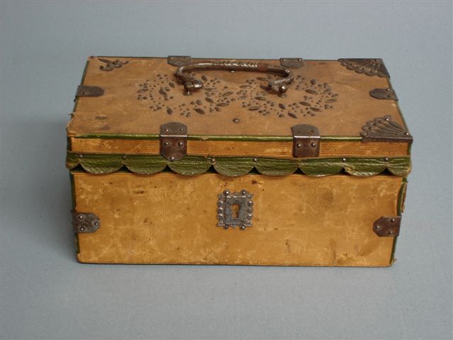 BOÎTE rectangulaire en bois recouvert de cuir fauve à cornières en métal. Couvercle orné de clous en métal à tête facettée, festonné de cuir vert et à anse mobile.