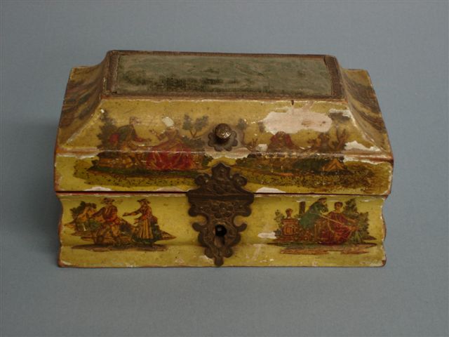 BOÎTE à ouvrages rectangulaire en bois laqué jaune. Décor rapporté toutes faces de gravures coloriées représentant des scènes galantes. Ornementation d'entrée de serrure et de charnières en laiton à motifs floraux. Couvercle porte-épingles.