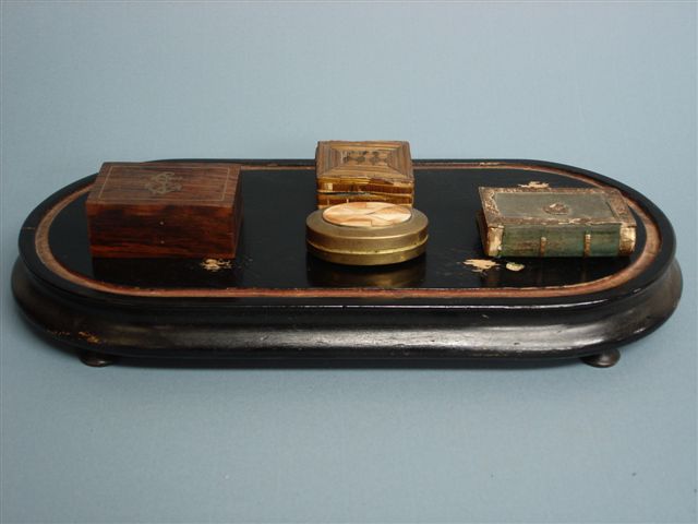 Quatre petites BOÎTES: en marqueterie de paille, en laiton incruté d'os, en carton formant livre et en bois exotique incrusté de laiton.