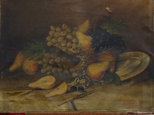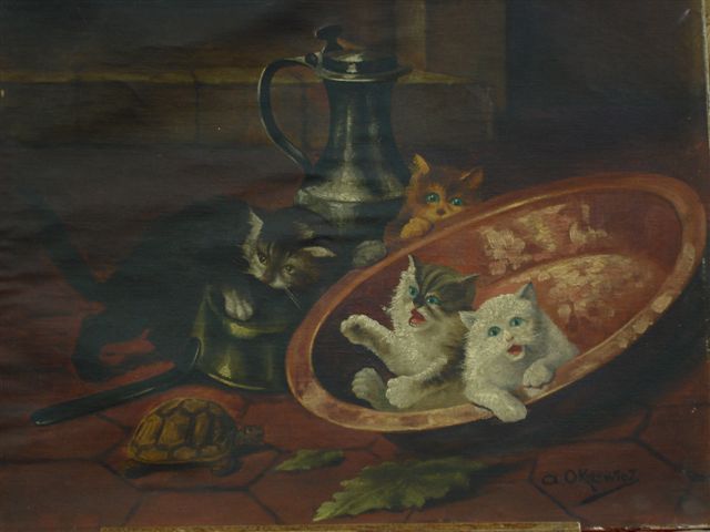 Chatons effrayés par une tortue, Nature morte aux fruits.