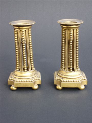 Paire de FLAMBEAUX en bronze doré. Base quadrangulaire reposant sur quatre pieds boule. Décor de rangs de perles sur la base et verticalement sur le fût ajouré.