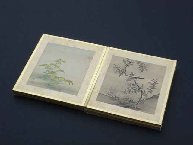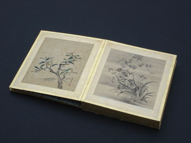 Sur la gauche, encre et polychromie sur soie par des artistes de l'école Sumiyoshi, école de peinture dérivée de Tosa, signées Hironaga, Hironao, Tadanobu, Naonobu..., sur la droite, encre sur soie: oiseaux et fleurs, la première signée.