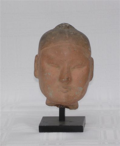 TÊTE montée sur socle en terre cuite style Han. Haut....