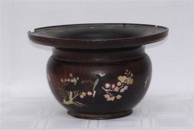 RÉCIPIENT en bois incrusté de nacre à décor floral.