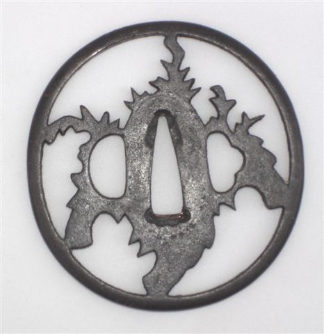 MARU-GATA en fer, décorée en sukashi-bori de feuilles de pawlaunia.