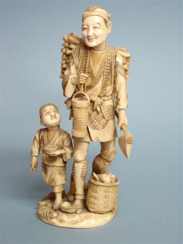 OKIMONO en ivoire, bûcheron debout et enfant.