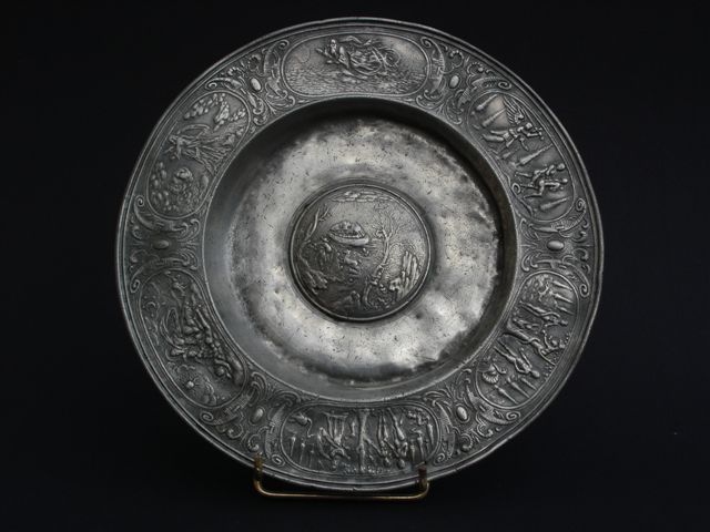 PATÈNE en étain de Nuremberg représentant sur l'ombilic l'Arche de Noé, sur le marli six médaillons retraçant la création du monde et l'histoire d'Adam et Eve, séparés par des cartouches à miroirs bombés.