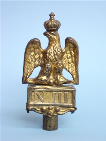 AIGLE de DRAPEAU en laiton doré travaillé au repoussé et verni. Aigle à tête couronnée tournée vers la droite, à bec légèrement ouvert, aux ailes déployées, les serres reposant sur le faisceau.