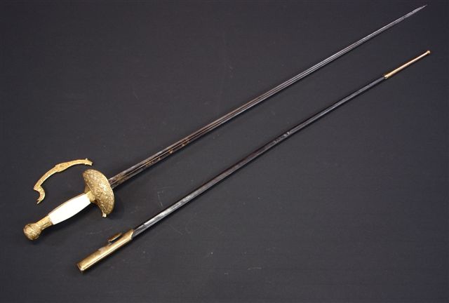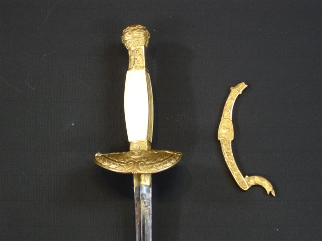 ÉPÉE d'Officier d'État Major. Fusée à plaquettes d'ivoire (postérieure). Monture en laiton ciselé et doré. Garde à une branche (accident). Clavier à tête du guerrier à l'antique. Lame triangulaire gravée, dorée et bleuie au tiers, motif à l'aigle. Fourreau en cuir à deux garnitures en laiton (postérieures).