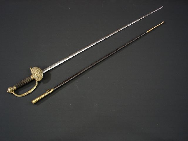 ÉPÉE d'Officier. Fusée en corne rainurée. Monture en laiton ciselé. Garde à une branche et clavier à l'aigle. Lame triangulaire (piqûres). Fourreau en cuir à deux garnitures en laiton