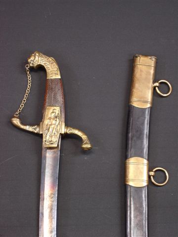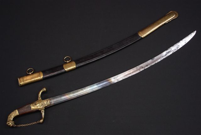 SABRE d'Officier de Cavalerie. Poignée en ébène quadrillé. Monture en laiton ciselé à double oreillons décoré d'Hercule. Lame courbe. Fourreau en cuir à trois garnitures en laiton.