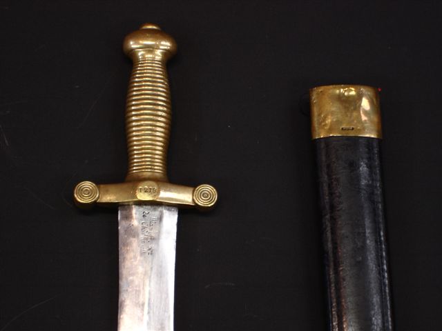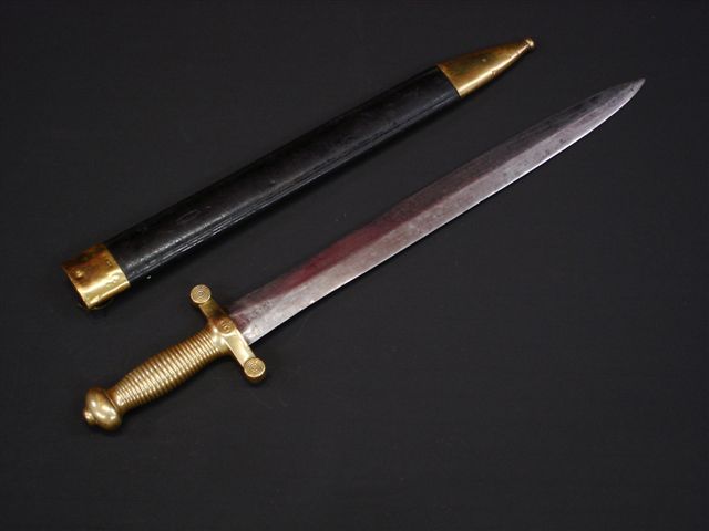 GLAIVE d'Infanterie modèle 1831. Poingnée en laiton. Lame à deux tranchants, datée "Avril 1832". Fourreau en cuir à deux garnitures en laiton.