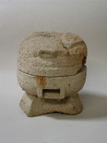 MEULE à grains en pierre granitique en deux éléments, la partie supérieure du tambour en enroulement de renard (accidentée). La partie inférieure percée d'un versoir, repose sur un piettement en doucine.