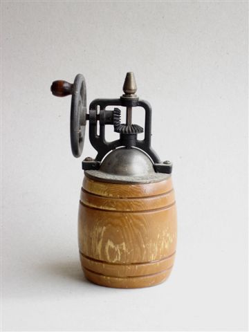 MOULIN à POIVRE. Modèle de forme tonneau en bois.