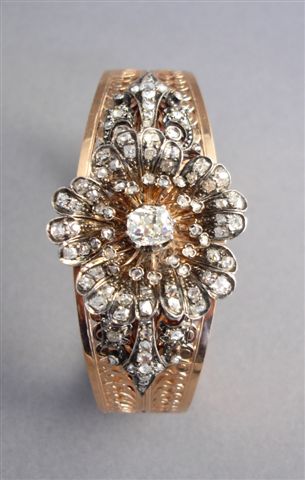 BRACELET en or jaune à décor ajouré d'une frise de palmettes, orné d'un motif de fleur - amovible - aux pétales épanouis d'un semi de diamants dont un plus important au centre - d' environ 0,75 carat - de taille ancienne. De part et d'autre de la fleur, deux petites appliques à motifs contournés de petits diamants.