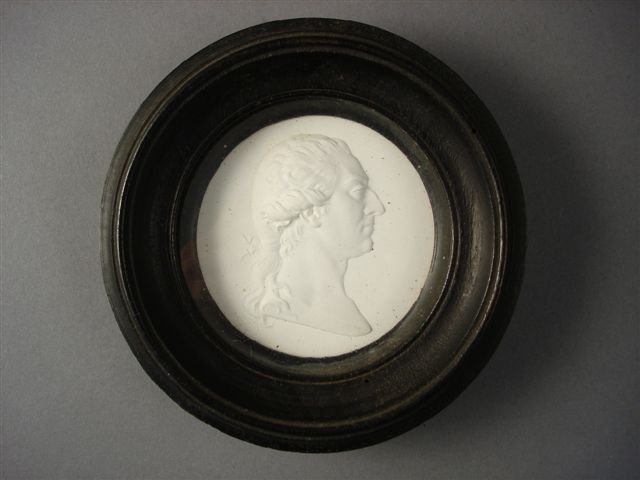 BUSTE du Roi, de profil à droite, tête et cou nus, les cheveux relevés au-dessus du front, bouclés et longs, noués derrière la nuque par un ruban.