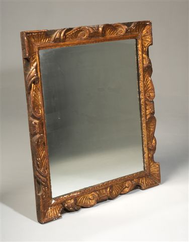 MIROIR en bois sculpté et doré. Il est bordé d'une frise de feuilles d'eau encadrée par de larges motifs d'enroulements et de feuillages stylisés.