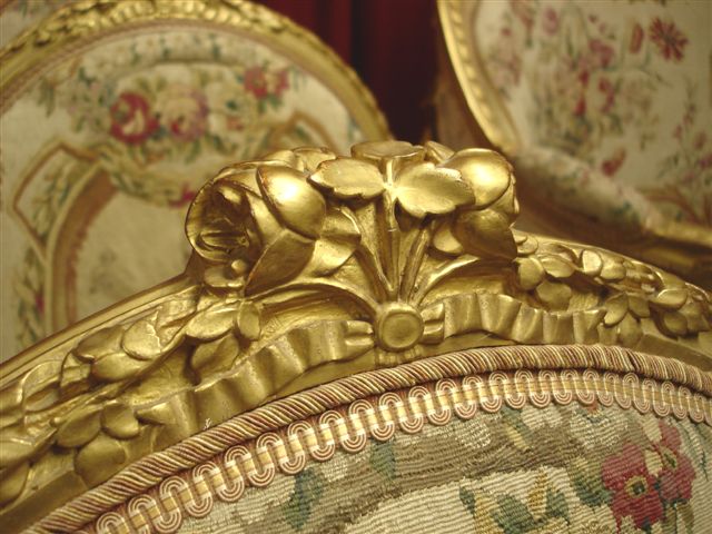 Important MOBILIER de SALON d'apparat - en bois redoré, mouluré et sculpté- comprenant: UN CANAPE CORBEILLE et SIX FAUTEUILS. Riche décor du répertoire iconographique Louis XVI: noeuds, rubans tors, roses, églantines et fleurons, rosaces.