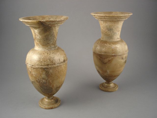 Paire de VASES en albâtre miel, sur piédouche, en forme de balustre au large col évasé.