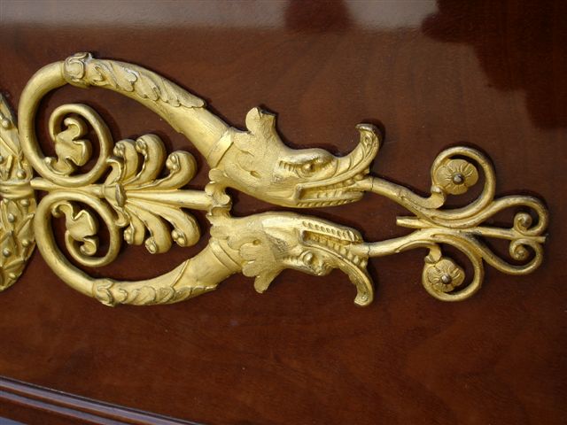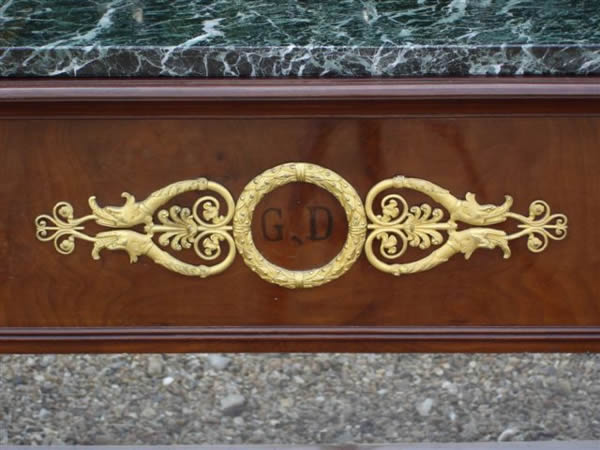 La ceinture, incurvée, repose sur deux pieds antérieurs à double poire. Les deux pieds postérieurs, en pilastre, enserrent une glace au mercure et sont réunis à la caisse par un décrochement contourné. Riche ornementation en bronzes ciselés et dorés au mercure: têtes de griffons, entrelacs, bagues à fond réticulé et tores de lauriers, palmettes. Initiales à triple reprise sur la ceinture: G.D.