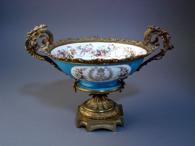 COUPE: vasque en porcelaine polychrome à décor floral sous fond bleu et d'une scène champêtre. Marques: chiffre du roi Louis Philippe surmonté de la couronne royale fermée, Sèvres 1846 et Château des Tuileries. Belle MONTURE en bronze doré sur piédouche avec anses de feuillages, tores de laurier.