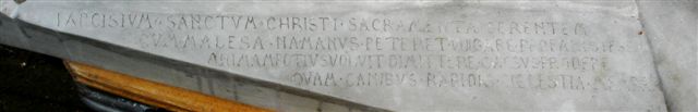 Grand MARBRE blanc, avec inscription latine composée par le pape Damase aux catacombes de Saint-Calixte: " Alors que Saint-Tarcisius portait le sacrement du Christ, une bande de forcenés lui demanda de le remettre en des mains profanes ; mais lui, jeté à terre, préféra donner sa vie plutôt que de livrer le corps céleste à des chiens enragés ".