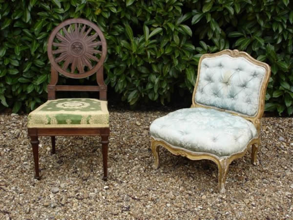 Elle repose sur quatre pieds fuselés. L'assise garnie d'une tapisserie en soie à décor végétal sur fond vert. (accidents, restaurations).