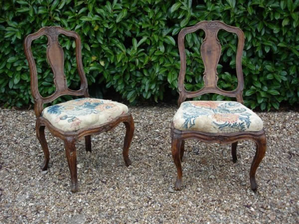 Paire de CHAISES à châssis en bois naturel mouluré et sculpté, à dossier mouvementé et ajouré d'une balustre feuillagée. Décor de coquilles sur le haut du dossier, de fleurettes sur la traverse inférieure. Les pieds sont galbés.