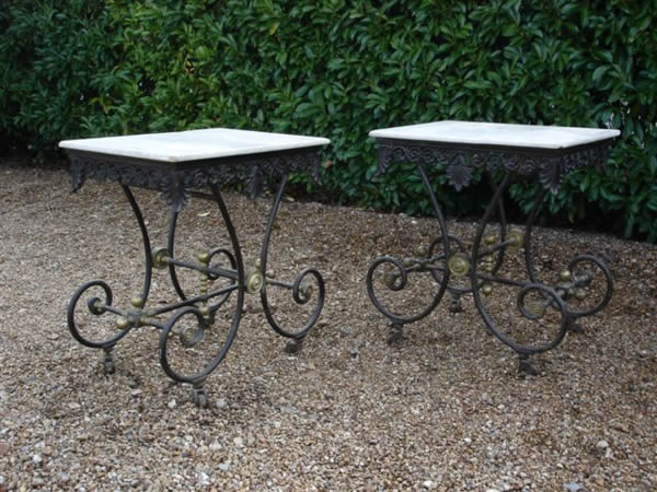 Paire de TABLES D'APPARAT en fonte à décor ajouré de feuillages stylisés en ceinture. Elles reposent sur des pieds à motifs d'enroulements réunis par des médaillons de bronze et une entretoise en H ornée de boules dorées.