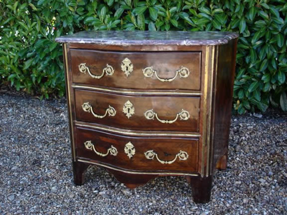 COMMODE dite sauteuse, galbée toute face en placage de palissandre. Elle ouvre à trois tiroirs en arbalète. Montants cannelés à fonçure cuivre, dessus marbre brèche rouge.
