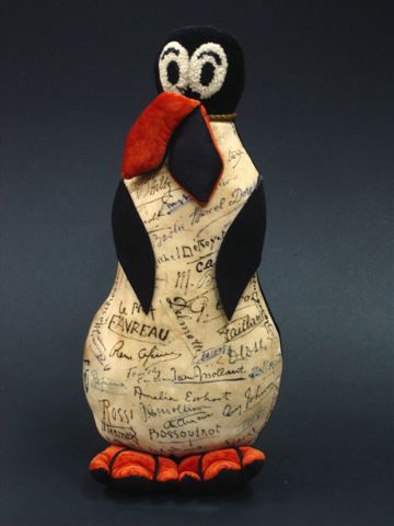 Il s'agit d'un pingouin en peluche paraphé par plus de 40 aviateurs qui comptent parmi les héros des grands raids aériens de l'entre-deux guerres. La réunion de ces autographes a pu être possible grâce à Jean Rullier, "chef de service au port aérien du Bourget " et son épouse, stewart.