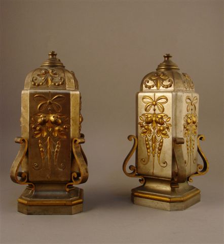 Paire de LAMPES en acier chromé et bronze doré de forme rectangulaire. Les pans coupés sont soutenus par quatre volutes en relief.