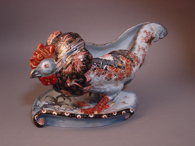 COQ en faïence, à décor de petit feu japonisant bleu et rouge sur fond laiteux à rehauts or.