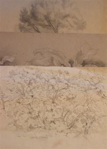 Eugène LAVIEILLE. Ensemble de trois études au crayon, à la craie noire et blanche et à l'encre. Étude d'arbre 45 x 33 cm, étude de plantes 29 x 47 cm, étude de bosquet 21 x 31cm.
