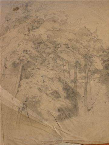 Eugène LAVIEILLE. Ensemble de quatre études au crayon, à la craie noire et réhauts de gouache. Étude d'arbres 30 x 48 cm, étude de forêt 40 x 45 cm, étude d'une lisière de forêt 30 x 45 cm, étude de troncs d'arbres 37 x 27 cm.