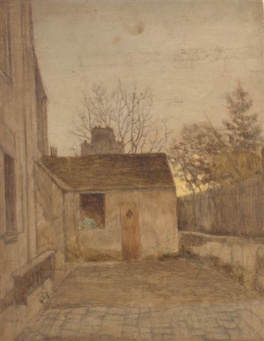 Eugène LAVIEILLE. Cour en hivers. Huile sur carton. 30 x 23 cm.