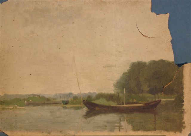 Adrien LAVIEILLE. Bord de lac. Huile sur carton. 29,5 x 40 cm. En l'état.